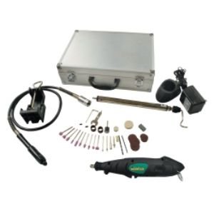 The tool's charge time is 3.5 hours. Chuck size: 1/12" - 1/8". Includes: charger, flex shaft, stand, work bench clamp, wrench, 3 arbors, 2 grinding arbors, 10 grinding wheels, 2 drill bits, 2 buffing wheels, various sanding discs, operating manual all packed in an aluminum case.